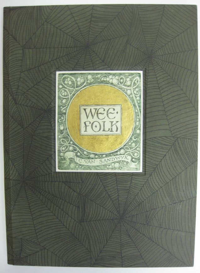# 134027 - SIGNED with original drawing SOLD SOLD UNIQUE AND NEVER PUBLISHED 6.75" X 4.75" (17 X 12 cm). Black stiff card boards with beige wrappers. Hand stitched together. Detailed etching on front cover showing many small magical creatures. Hand painted gold highlights. Onlay for title on front. Green and gold marbled endpapers. All manuscript writing throughout. Two etchings taking up two pages each inside the book (one is the same as the one on the front cover). Unique and never published. Signed by Charles beneath the title with a little drawing. A wonderful little one of a kind book. |
