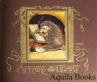 Affairs of the Heart #126025 - 2nd printing, 2007 SOLD #131552 - SIGNED 1st print., 2003 SOLD Signed by Van Sandwyk in black ink on first page. Oblong octavo. Original brown wrappers with full color hedgehog illustration on cover. Illustrated with 14 tipped-in plates from coloured paintings of animals and additional sketches. |