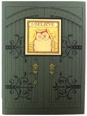 I Believe: Two Poems and a Hidden Thought [8] pages, Savuti Press. Octavo (23 X 17 cm.) Bound in original brown stiff paper with attached wrap around paper jacket. The jacket is a rich green with fantastic decoration and an onlay title. Green and gold marbled paper end sheets. Beautiful illustrations and elegantly scripted text throughout. #133981 1st Edition, 2012 SOLD |